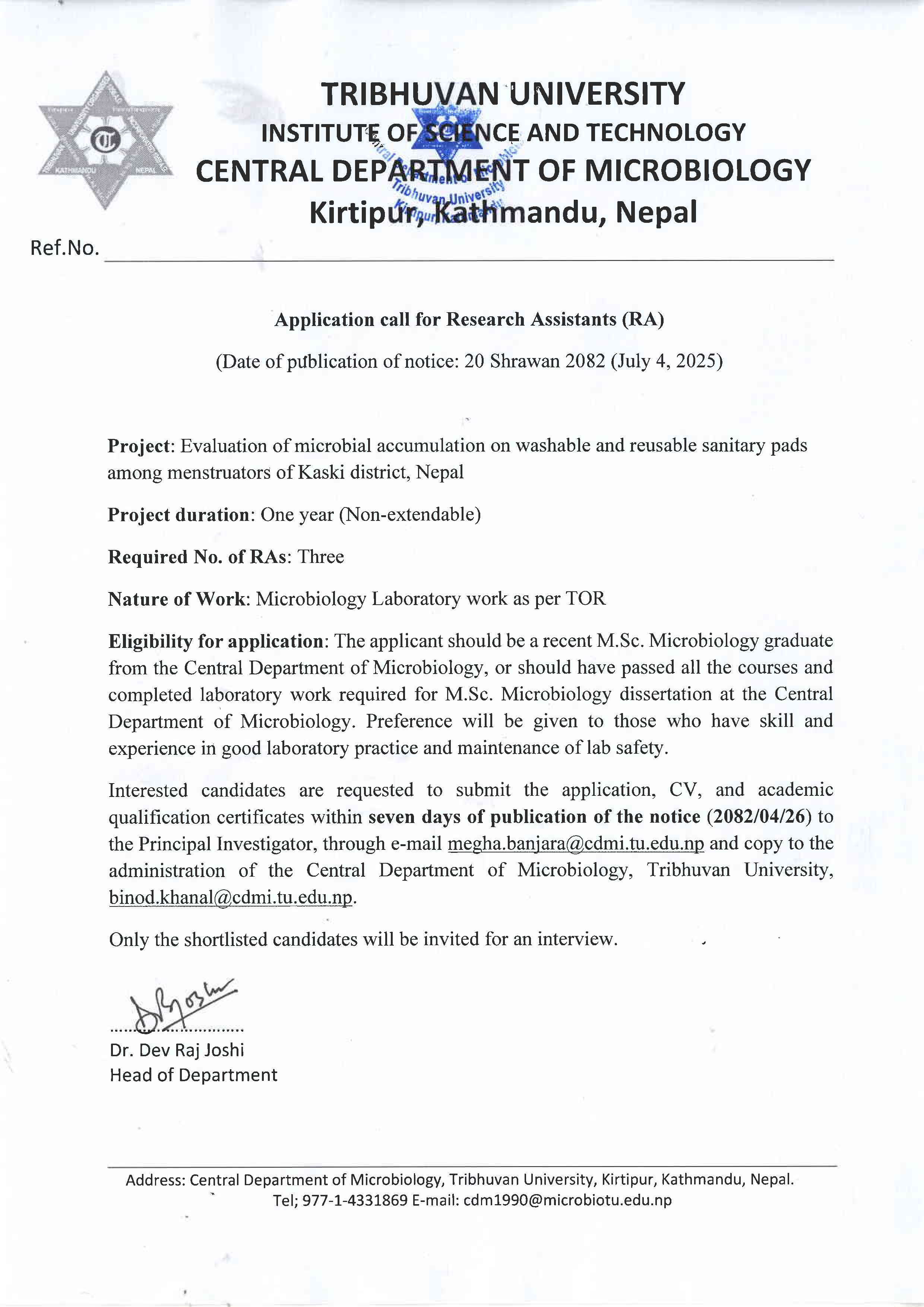 Application call for Research Assistant (RA)